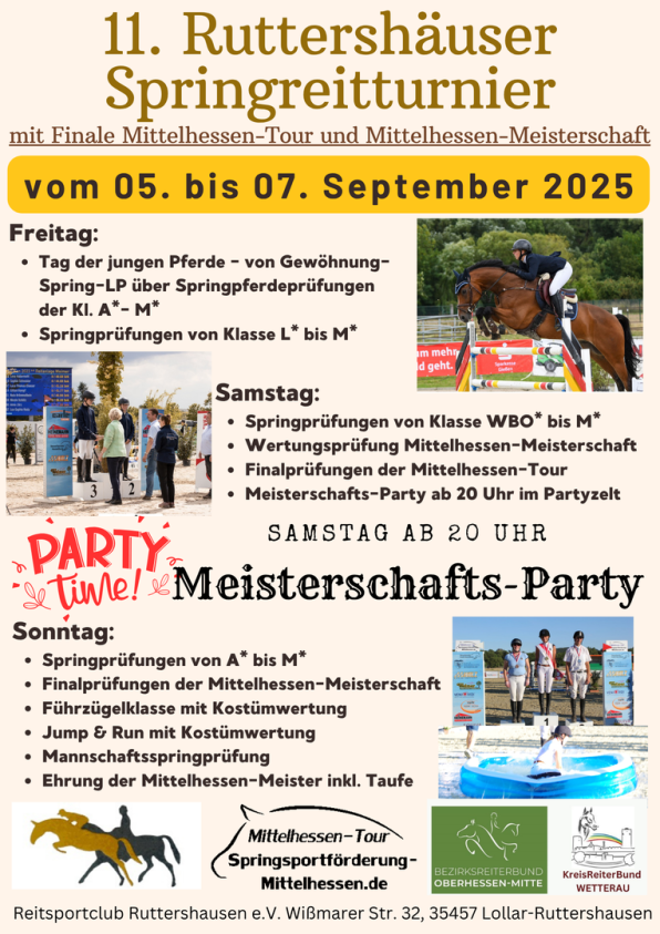 Wir, der Reitsportclub Ruttershausen e.V., veranstalten in diesem Jahr unser 11. Ruttershäuser Springreitturnier vom 05. bis 07. September 2025 mit den Mittelhessen-Meisterschaften der Bezirksreiterbünden Oberhessen-Mitte und Wetterau.